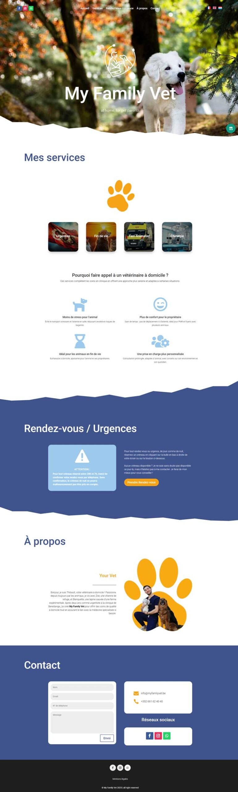Le site a été pensé pour offrir une navigation fluide et intuitive, reflétant la douceur et la proximité des services vétérinaires à domicile. L’interface épurée met en avant les informations essentielles, facilitant la prise de rendez-vous en ligne et l’accès aux services proposés. L’utilisation de couleurs apaisantes et de visuels chaleureux vise à instaurer une atmosphère de confiance et de bien-être pour les propriétaires d’animaux.